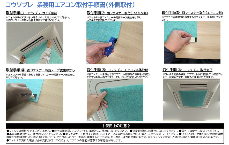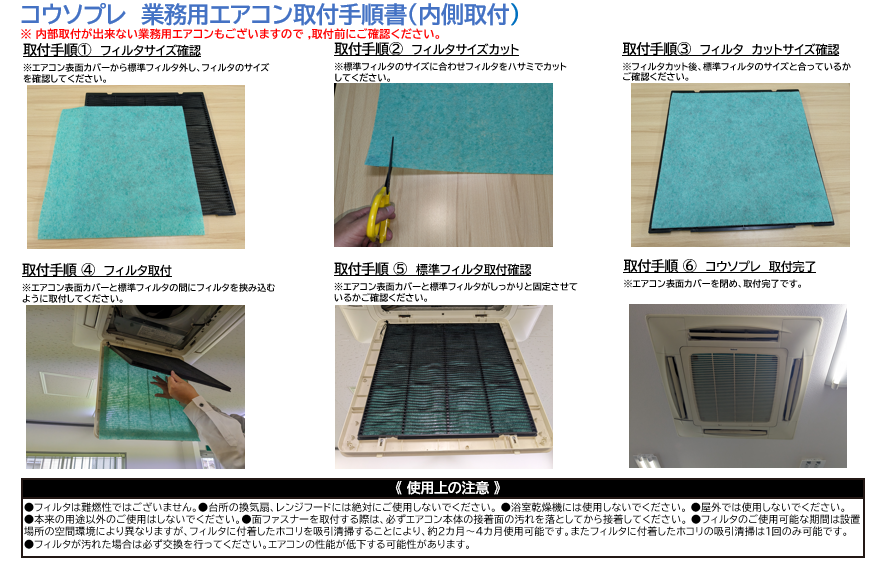 | 注意事項 | ・フィルタは難燃性ではございません。 ・本来の用途以外でのご使用しないでください。 ・フィルタが汚れた場合は必ず交換を行ってください。空調機器の性能が低下する可能性があります。 ・フィルタのご使用可能な期間は設置場所の空間環境により異なりますが、フィルタに付着したホコリを吸引清掃することにより、約2カ月~4カ月使用可能です。またフィルタに付着したホコリの吸引清掃は1回のみ可能です。 |